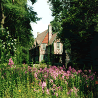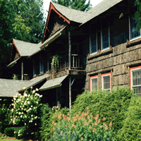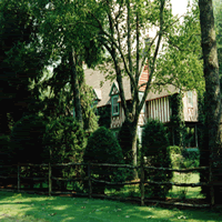 homes are set off by flowerbeds and trimmed hemlock hedges.