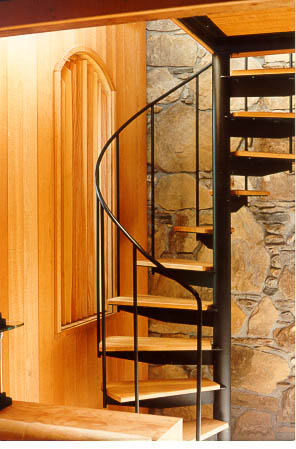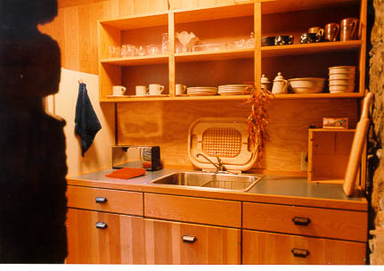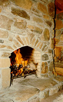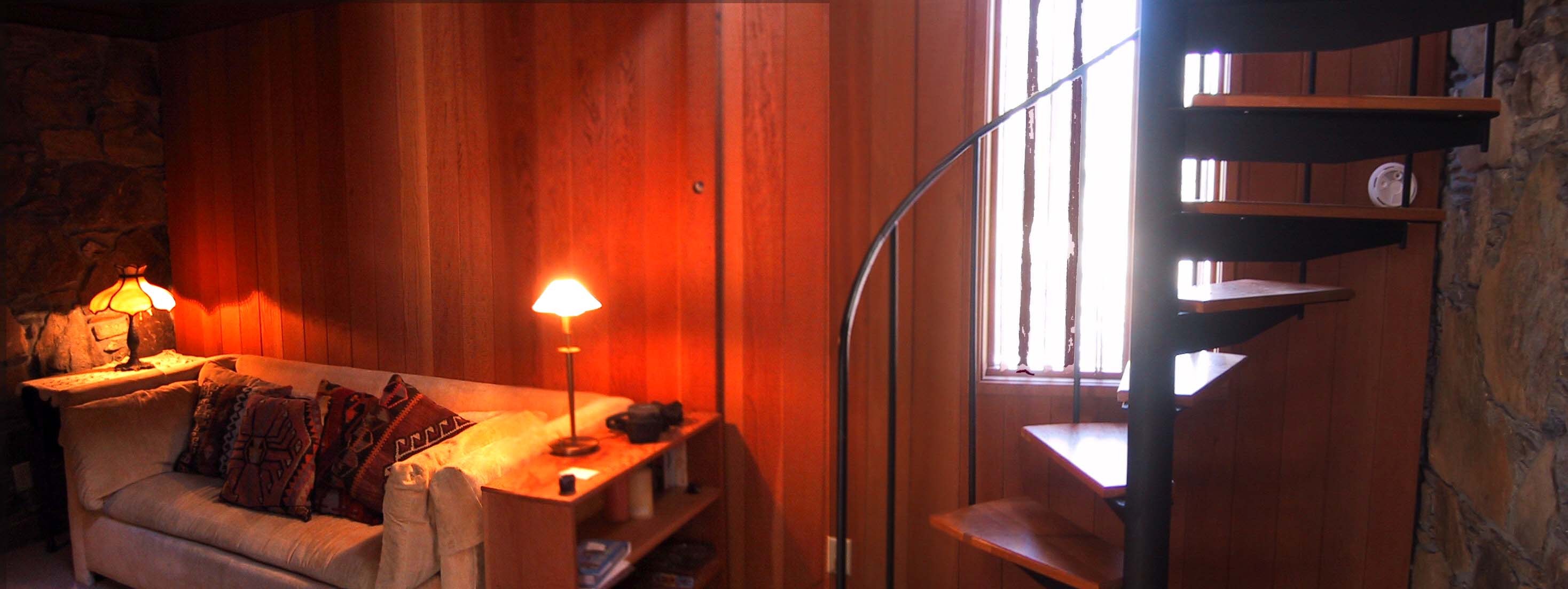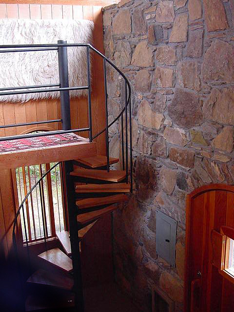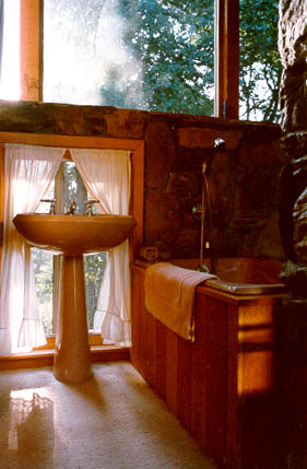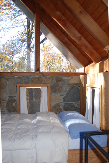 In the loft balcony bedroom, a deep "Greek" Kohler tub with hand-held shower backs up to the chimney and looks into the tulip tree. Perfect for true relaxation, the nearby queen-size bed offers magnificent views of the starry sky through ten-foot tempered glass gables. |